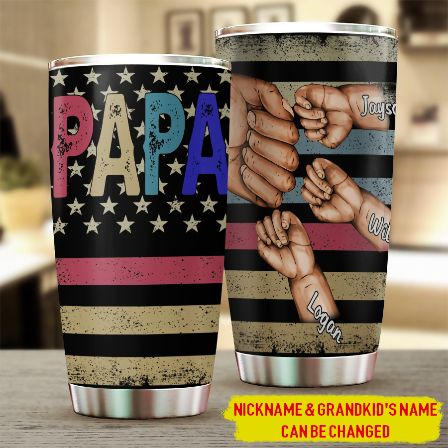 20 oz Personalized Papa Grandkids Hands Flag Tumbler Cup with Lid